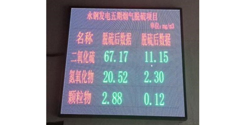 公司EPC總承包的聯(lián)峰鋼鐵有限公司電力廠5#煙氣脫硫項目自投運以來,通過對鍋爐煙氣脫硫前后參數(shù)的采集與對比,對脫硫劑小蘇打的噴吹量實現(xiàn)自動調(diào)節(jié),經(jīng)過一個月的調(diào)試,除塵器出口煙氣含塵顆粒物、SO2,氮氧化物的含量均低于國家超低排放行業(yè)標(biāo)準(zhǔn),達(dá)到公司承諾運行保證值,滿足性能考核要求。脫硫后的排放數(shù)據(jù)實時顯示到大屏,對外公布。