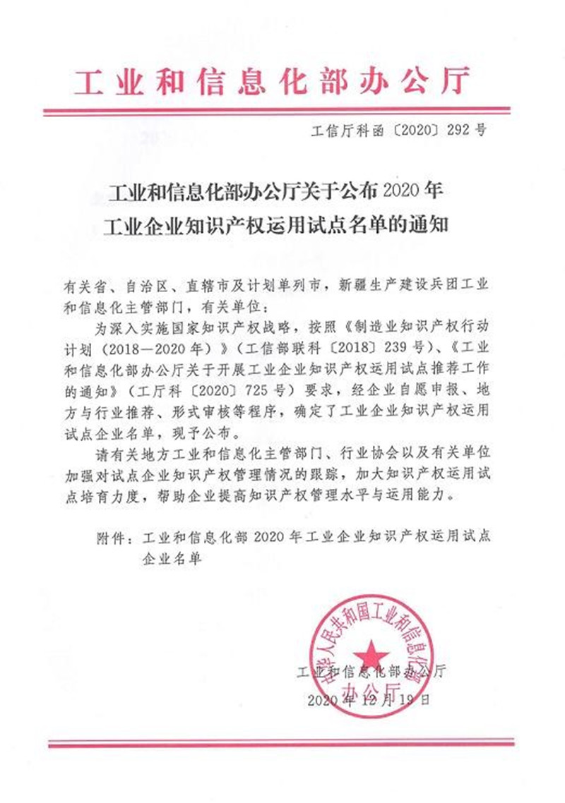 公司入選工信部2020年工業企業知識產權運用試點單位
